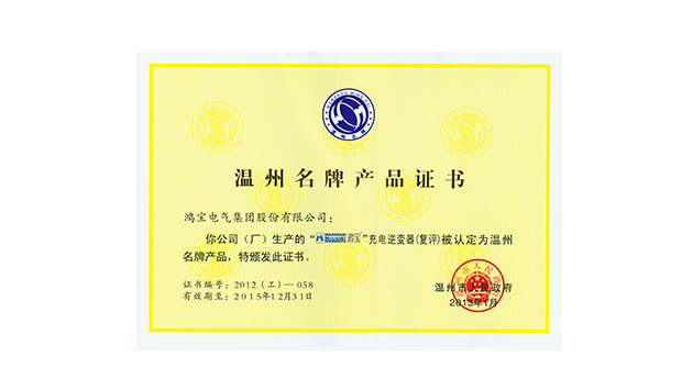 “鴻寶”牌充電、逆變器復評為溫州名牌產品
