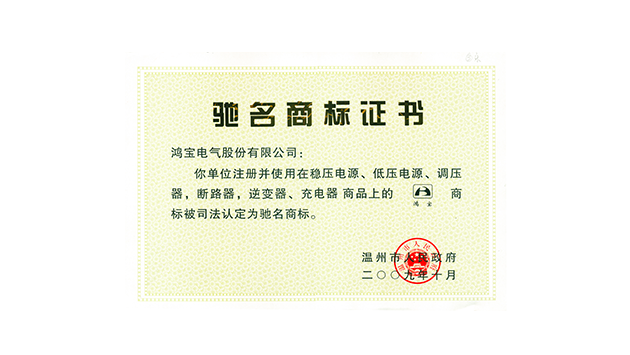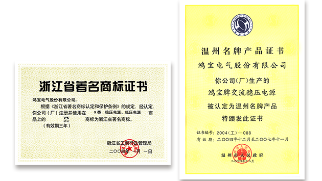 “鴻寶”牌穩壓電源被溫州市人民政府認定為“溫州名牌”產品