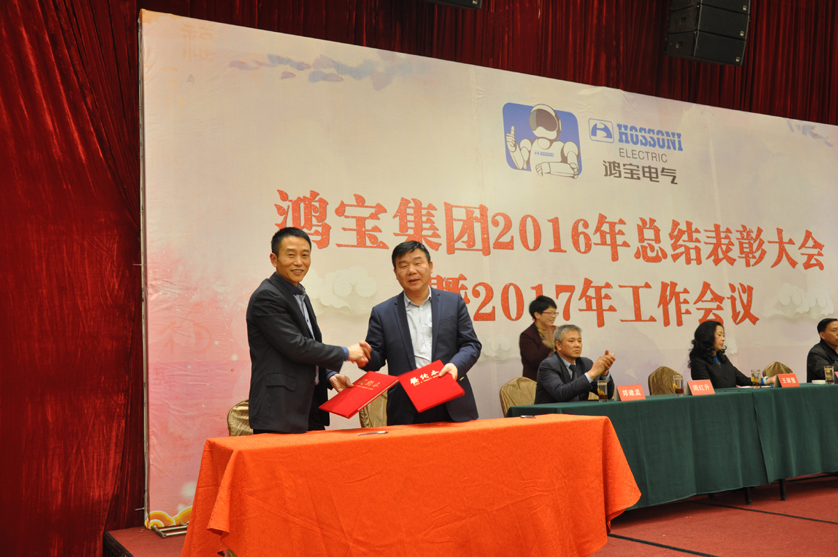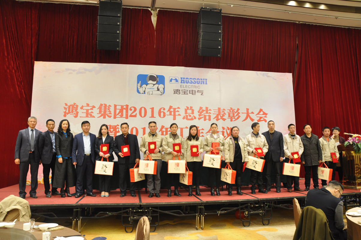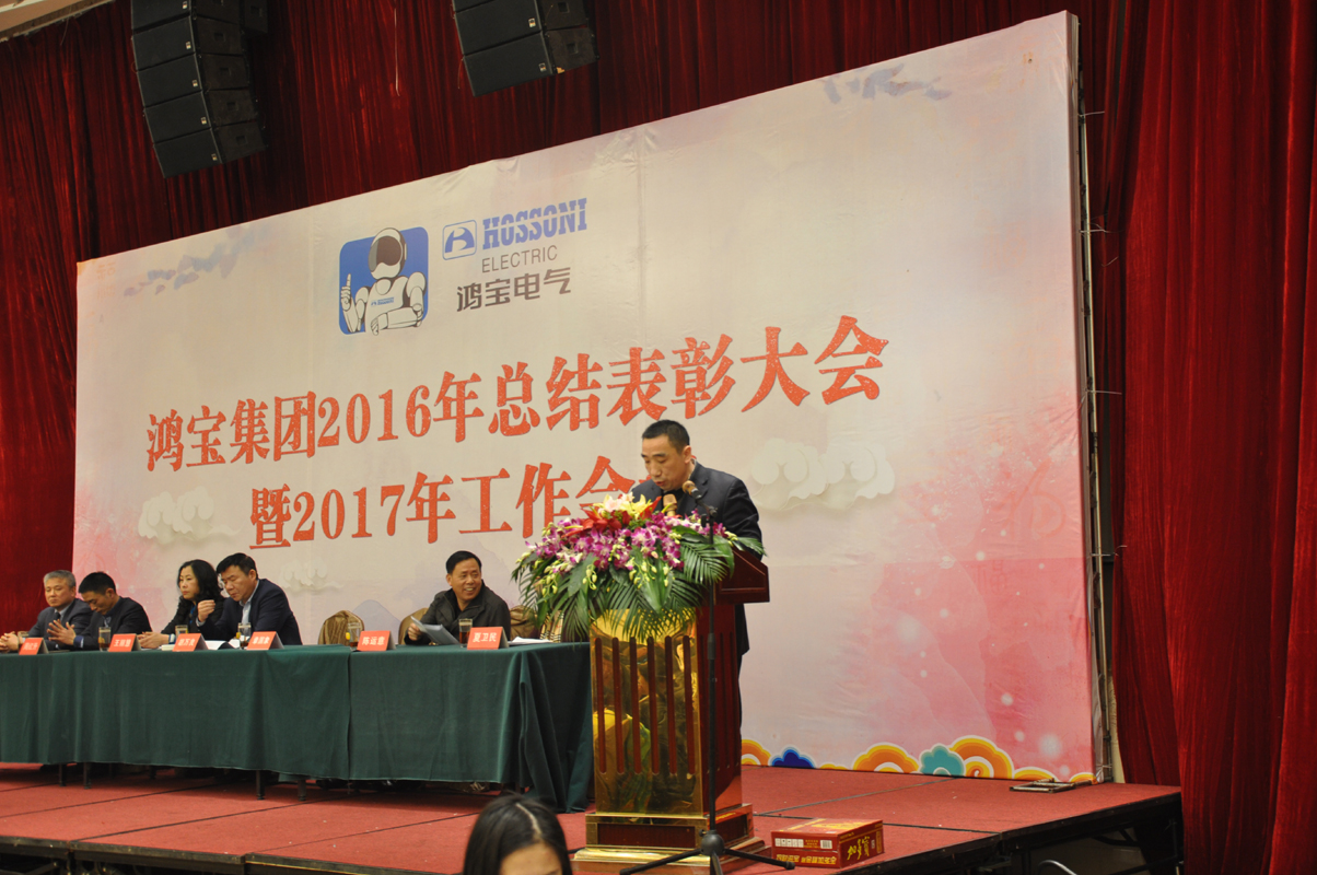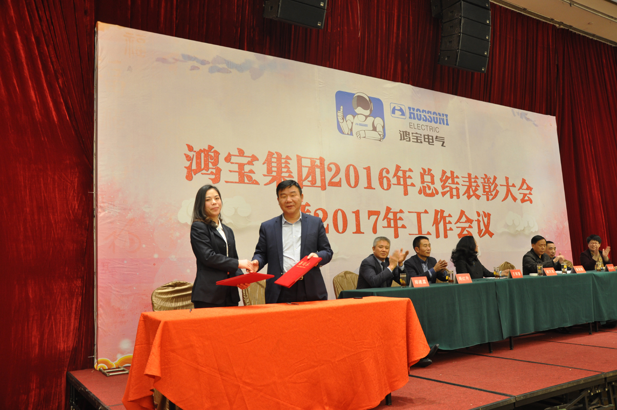 1月15日下午,鴻寶電氣集團在柳市新新雅假日大酒店貴賓樓A\B廳隆重召開2016年度總結表彰大會暨2017年工作會議。出席本次會議的領導有公司董事長、總經理、副總經理、監事長、各部門主管及公司員工300余人參加會議。會議由辦公室主任夏為民主持,會議在莊嚴神圣的國歌聲中拉開了序幕,公司監事長王麗慧為大會致詞,生產副總經理周紅升宣讀了表彰文件,公司隆重表彰了10位優秀員工,銷售部陳蓮蓮和黨員鄭永忠代表優秀員工和優秀黨員做了發言,技術副總經理陳運意就如何提升產品質量做了詳細的質量報告,總經理章國象認真客觀地總結了公司2016年的工作取得的成績和榮譽,并提出了2017年工作目標和計劃。會議上董事長胡萬良分別與生產副總經理周紅升、技術副總經理陳運意和銷售代表陳蓮蓮分別簽訂了安全生產管理協議、質量管理協議和銷售考核協議。最后董事長胡萬良作了重要講話,他對集團公司2016年的工作做了具體的評價,并指出2016年,我們面對世界經濟疲軟,國內外市場復雜嚴峻等不利因素,全體員工團結一致,不斷進取,逆勢而上,保持了企業平穩發展。同時,胡董提出:在新的一年, 全體員工要做到不因成績而驕傲,不因挫折而氣餒,我們要有同一個信念,目標一致,做到有目標、有計劃、有實施、有檢查、有監督、有結果,他對大會提出了七點意見和要求,他指出全體員工要以百折不撓的精神從團隊合作、提高生產效率、狠抓產品質量、全力開拓新市場等方面要求員工堅定信心,團結一致,攻堅克難,再創鴻寶新的輝煌。